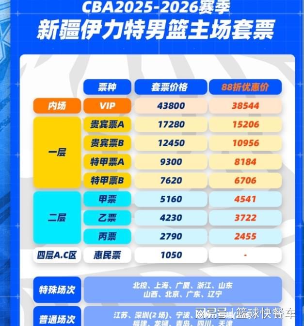 当然,其他档次的门票,就便宜不少。这其中一层A级套票价格优惠完为15206元,每场比赛平均价格为724元。而这其中最便宜的套票价格,为1050元,算下来每场比赛只需50元。可以说,在套票价格上,新疆队还是给了球迷们诸多选择。既可以选择比较贵的VIP门票,也可以选择适应经济门票。而且,在门票档次上,他们还划分了9个档次,球迷们有诸多选择。